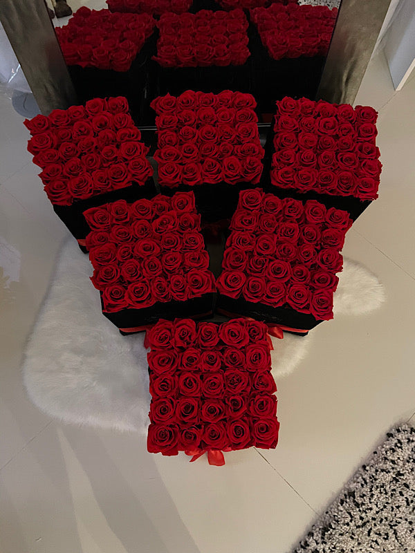 Box size: 10”x 10” Brickell 25 red roses in velvet square box will last years....