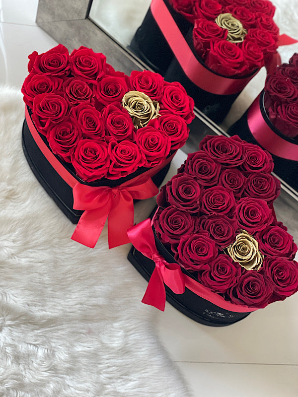 Box size: 10” x 8” 19 eternal roses with 1 gold rose in Velvet heart...