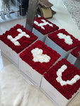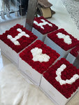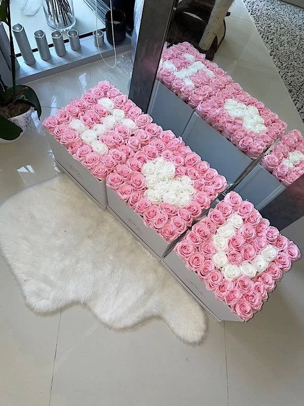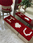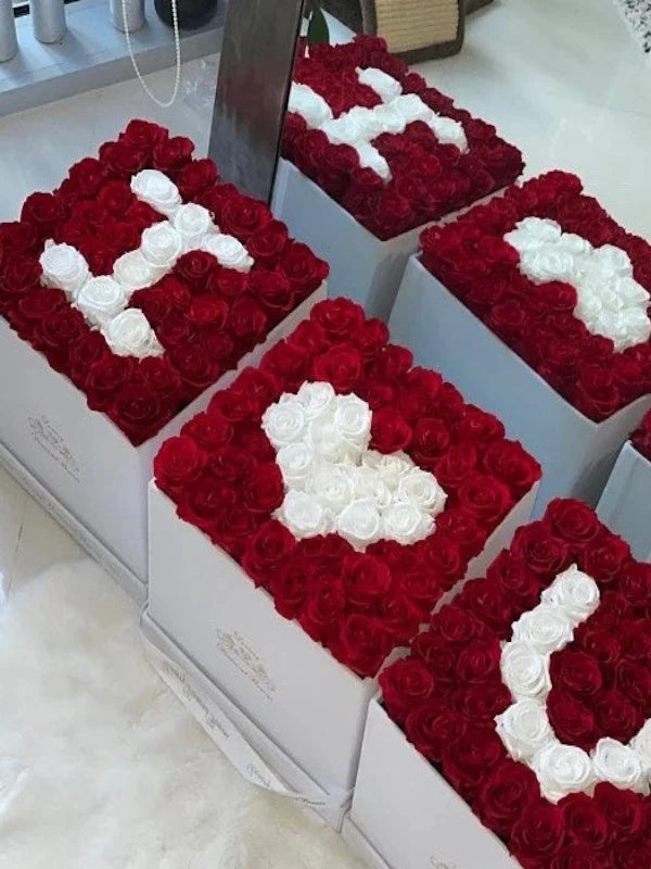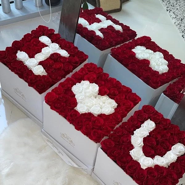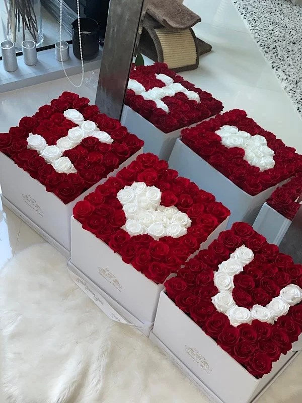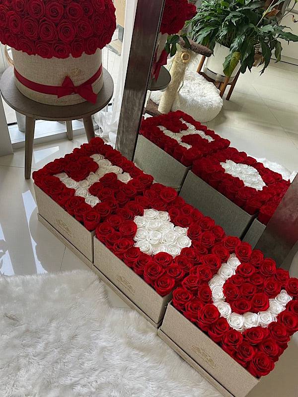 I love you flowers bouquet in boxes total up to 130 preserved roses that last a year. Linen box and customizable forever roses color combination. Perfect gift for Valentine’s Day and anniversary Flowers Miami.