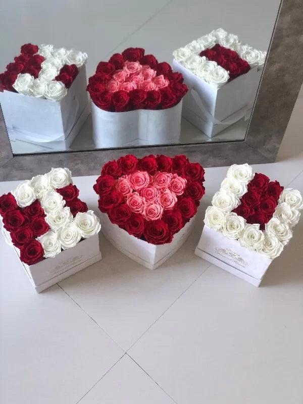 Up to 53 forever roses ( 2 Square boxes with 16 roses each and 1 heart shape box with up to 21 roses ) will last years