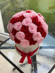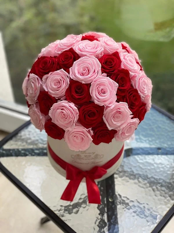 50 preserved roses mix 2 colors in round box. Flower arrangement is customizable and you can choose any 2 rose color