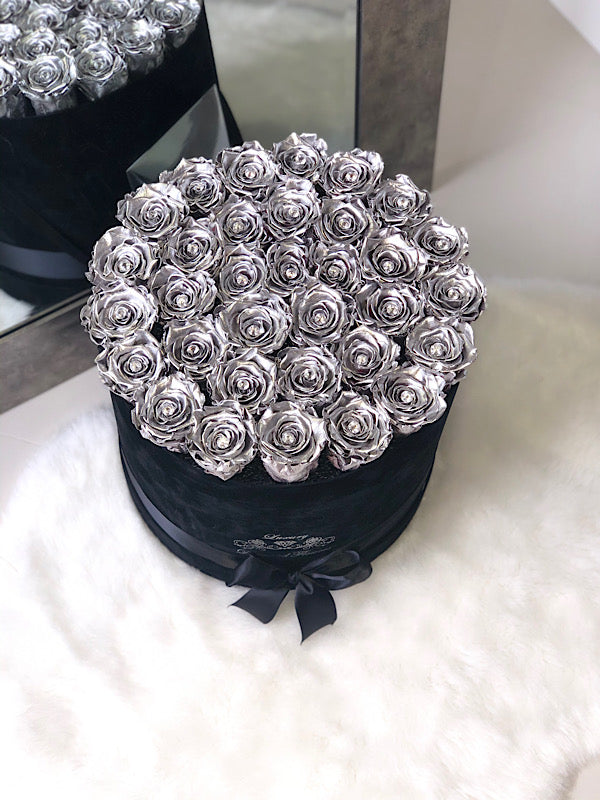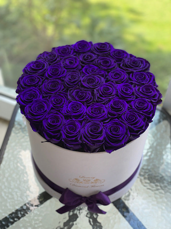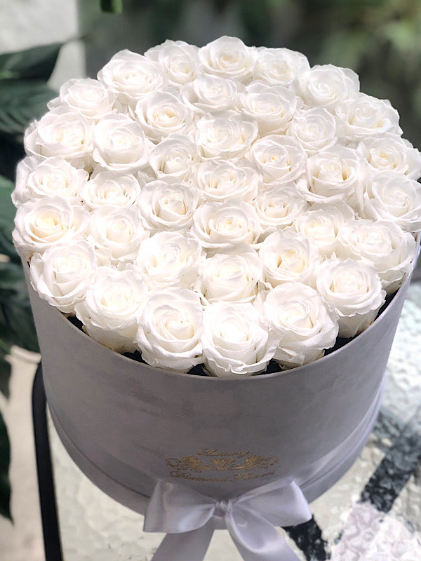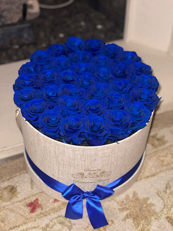 40 forever roses box will last years. Choose rose color for Bora Bora arrangement forever roses