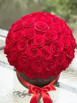 50 red roses in box dome design in linen round box will last years. Same day flower delivery in Miami.