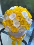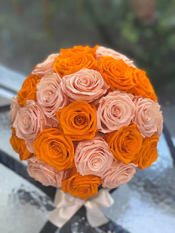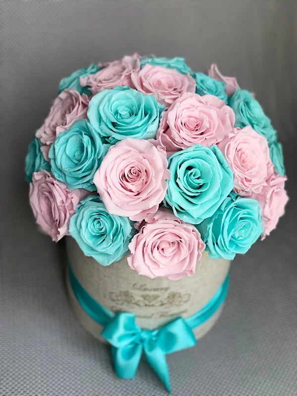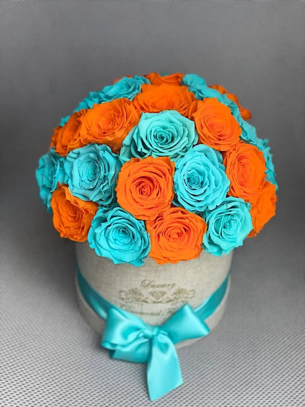 Miami Mix roses bouquet is up to 30 Preserved Ecuadorian Roses that last years in linen box round shaped and dome design. Choose any 2 rose colors.
