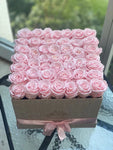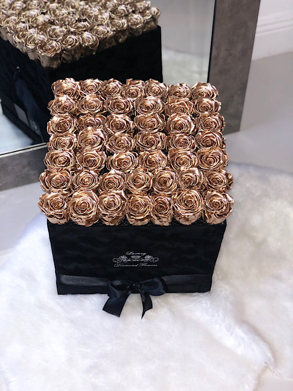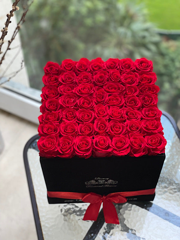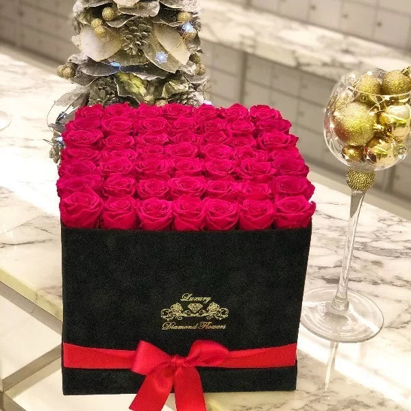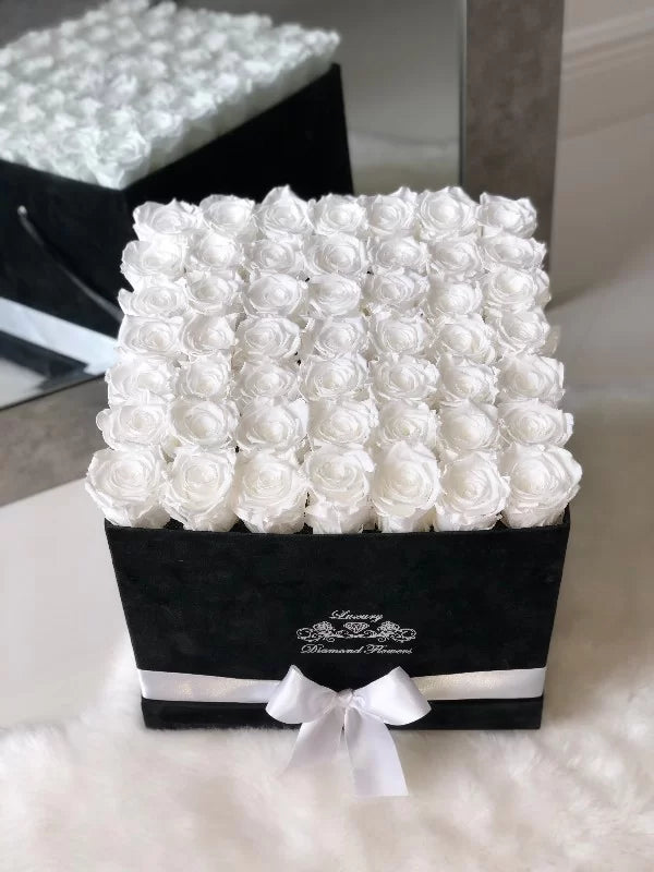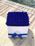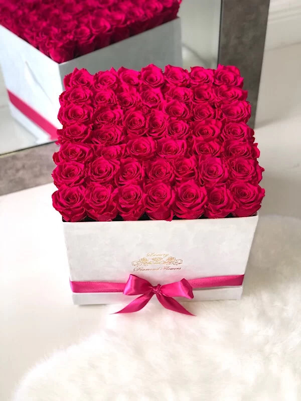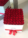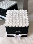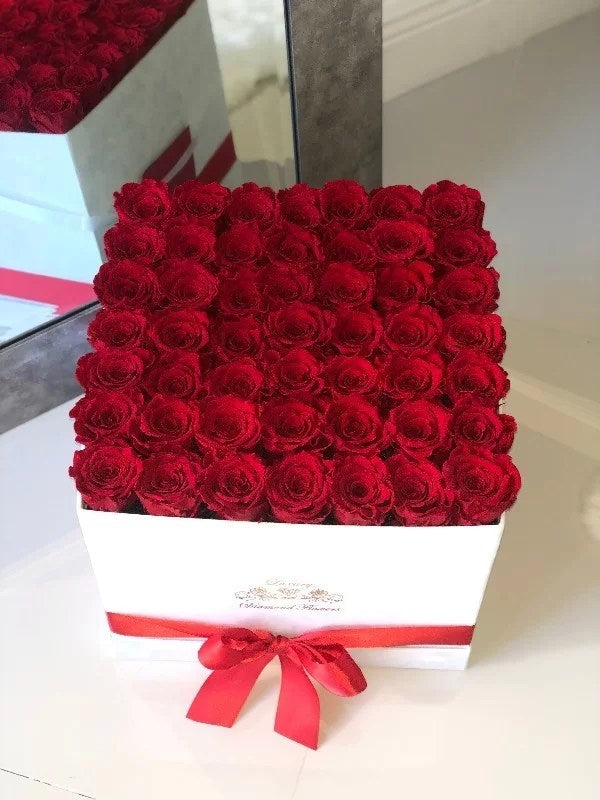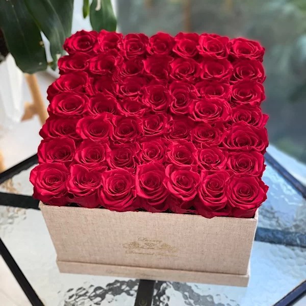 Up to 49 preserved roses in square linen box. You can choose any rose color
