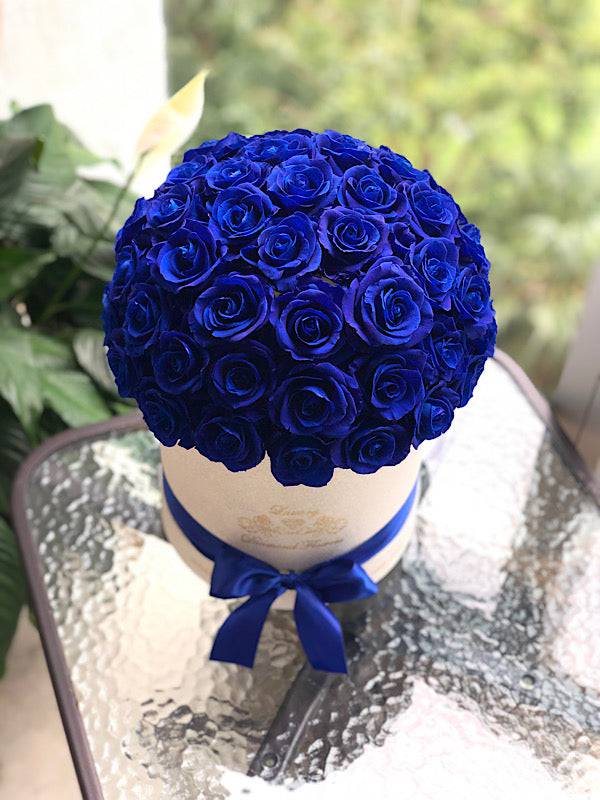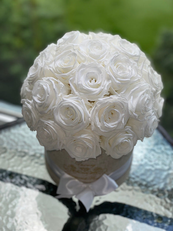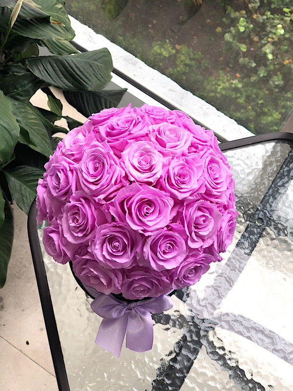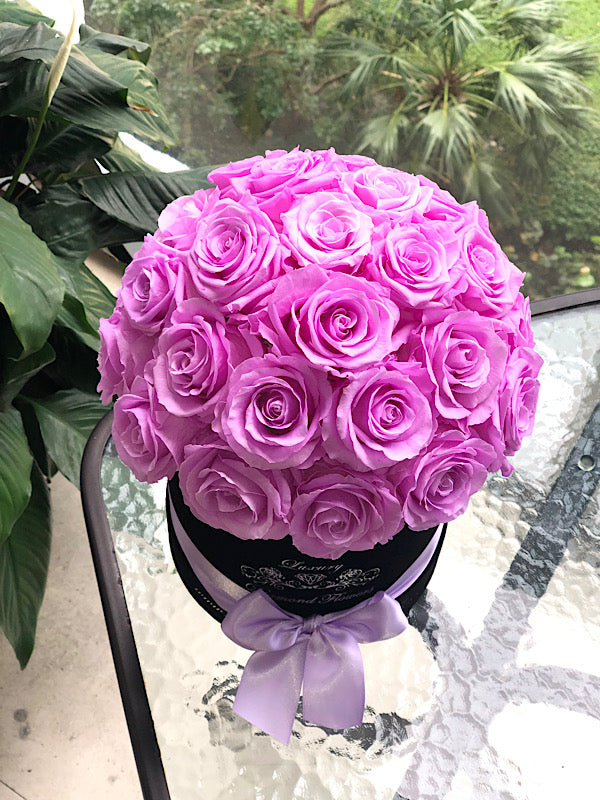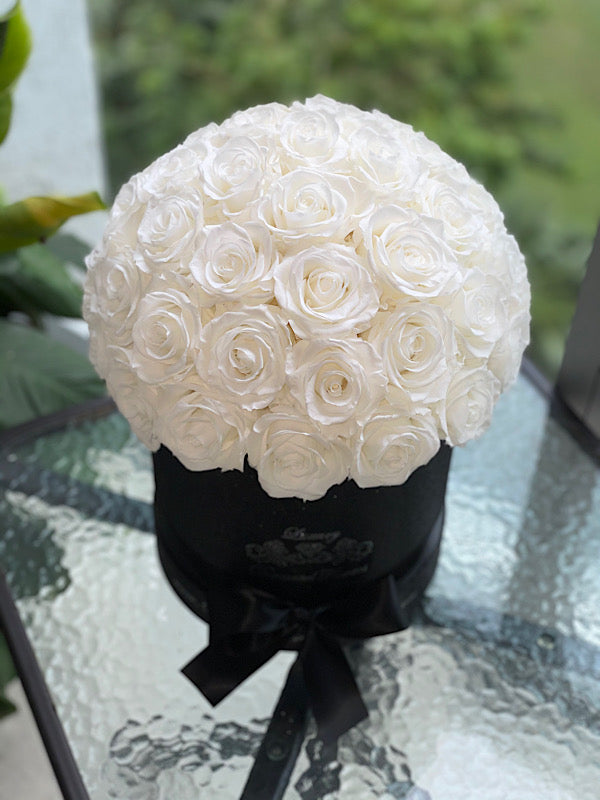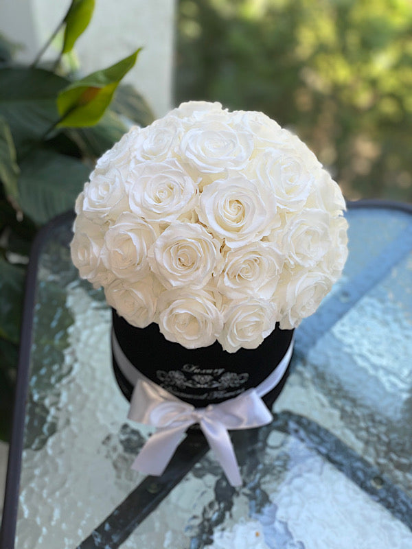Miami flowers Preserved 30 roses that last years in round box with dome design. Arrangement is customizable with any roses color. Black velvet or linen box available.