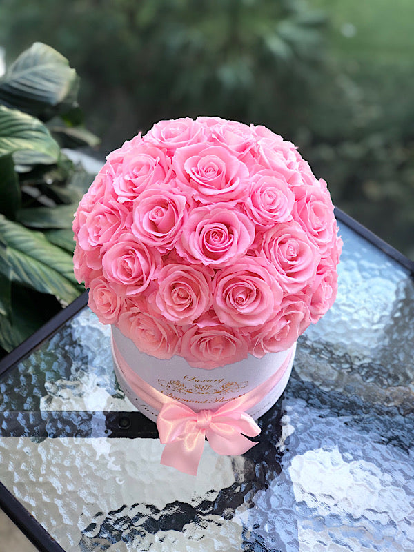 Up to 30 preserved roses in round box will last years. You can choose any rose color