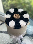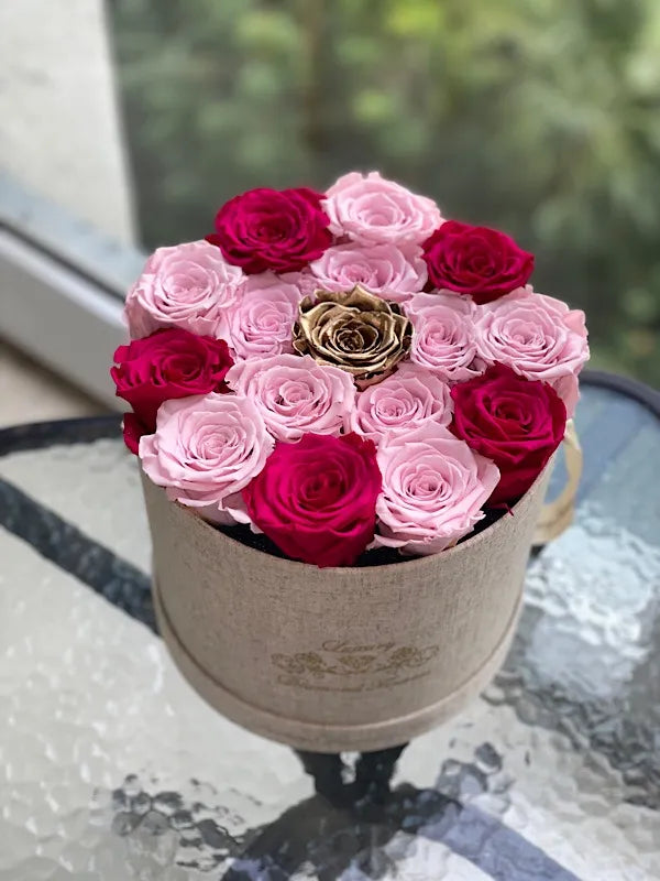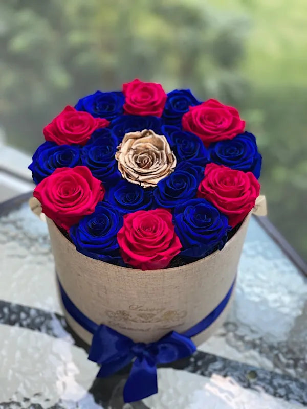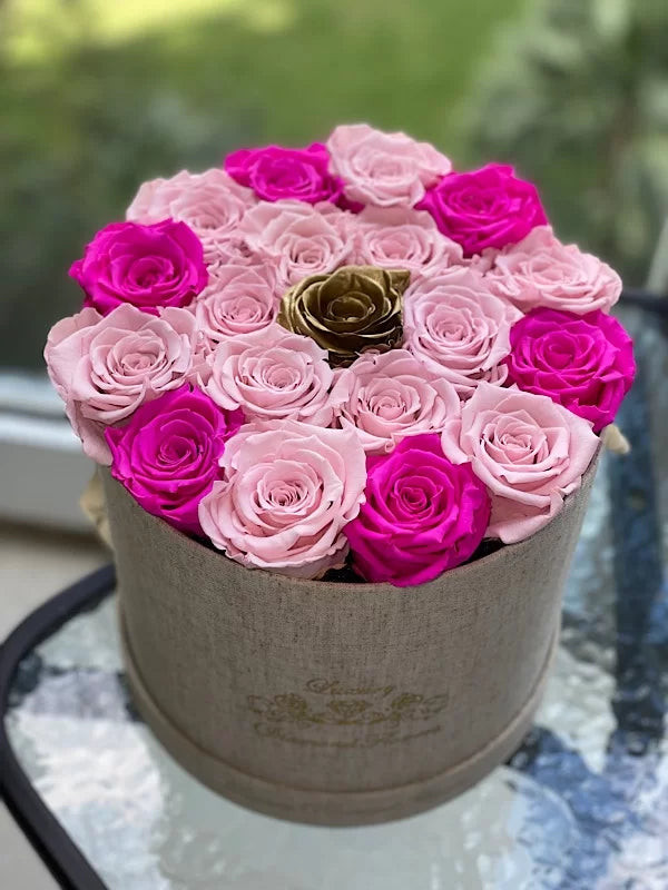 Up to 18 forever roses mix of 2 color with Gold rose in round velvet box. You can choose any rose color