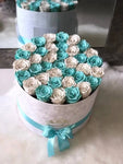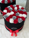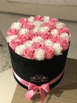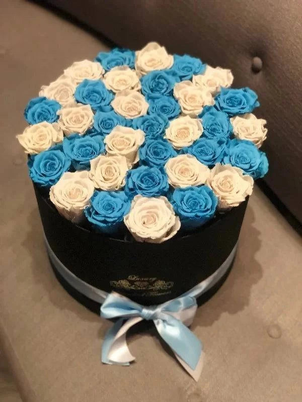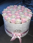 Up to 40 forever roses 2 different color last years in round linen box. Please choose roses color