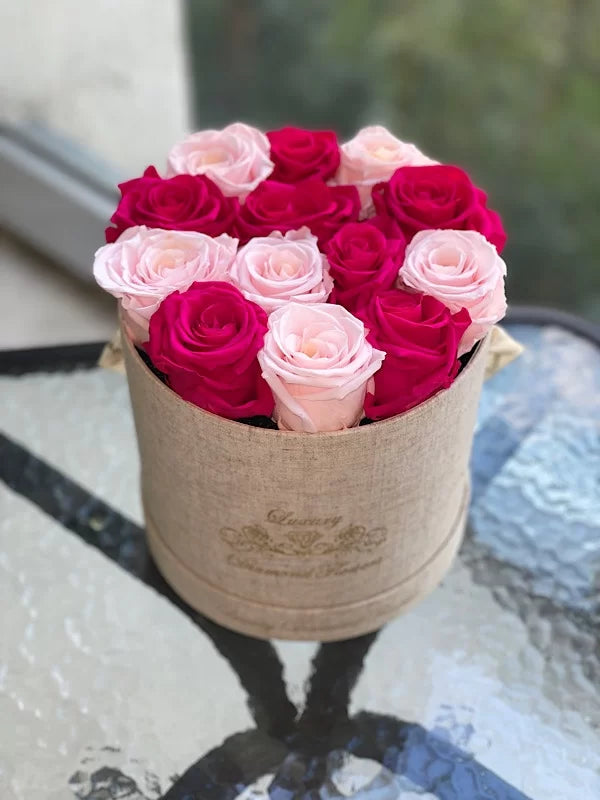 Hawaii hot pink roses mix with light pink roses is up to 14 preserved roses that last years. Linen round boxes or velvet round box. Available flower delivery service in Miami Beach and South Florida same day.