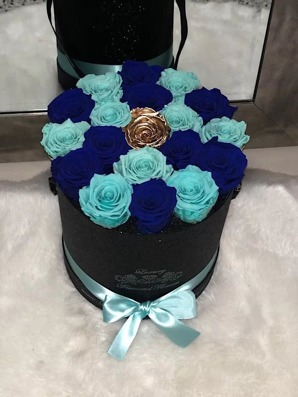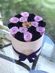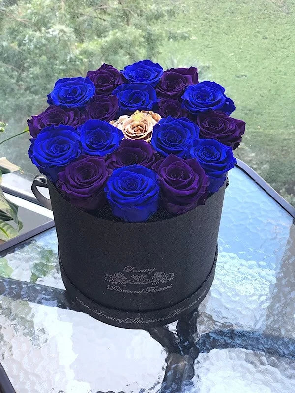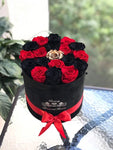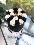 Up to 19 roses last years in Hollywood flower arrangement will last years in round box.