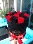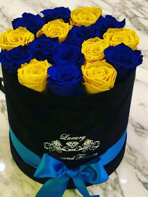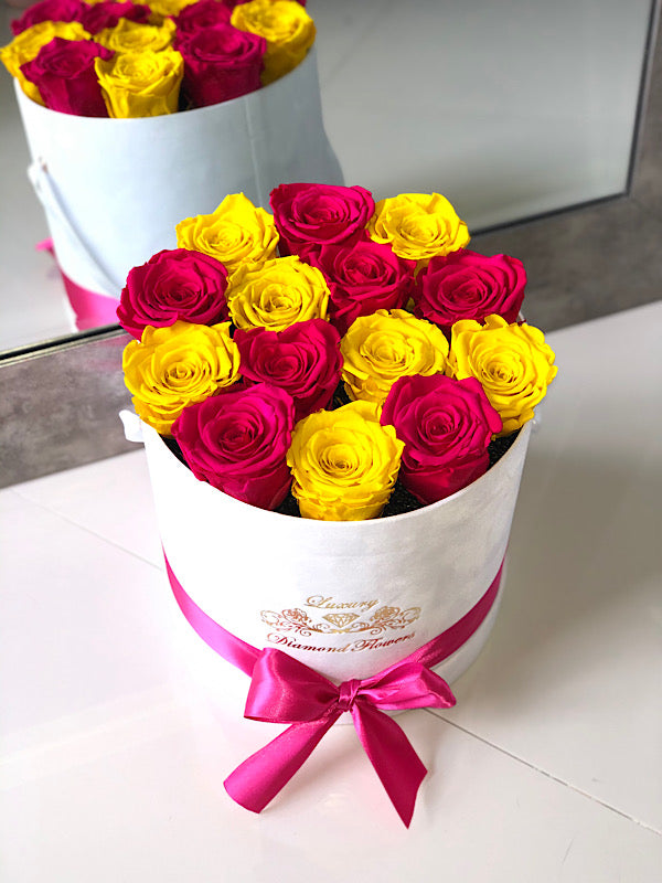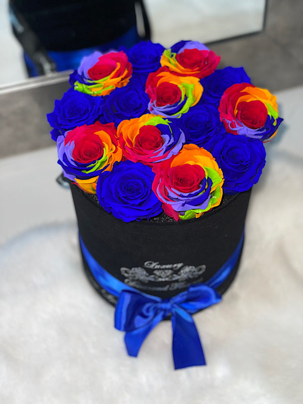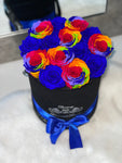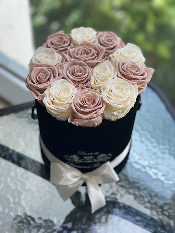 Forever roses in round velvet box will last years. London Mix roses is customizable and you can choose any rose color you want.