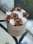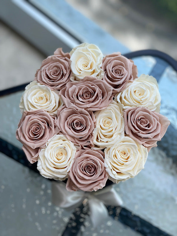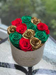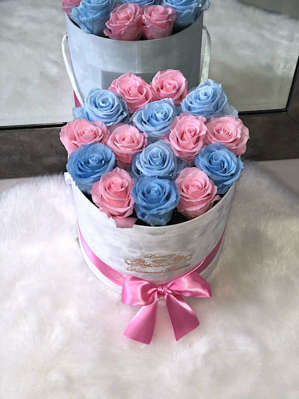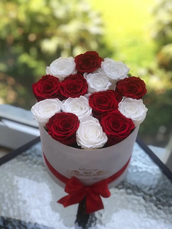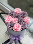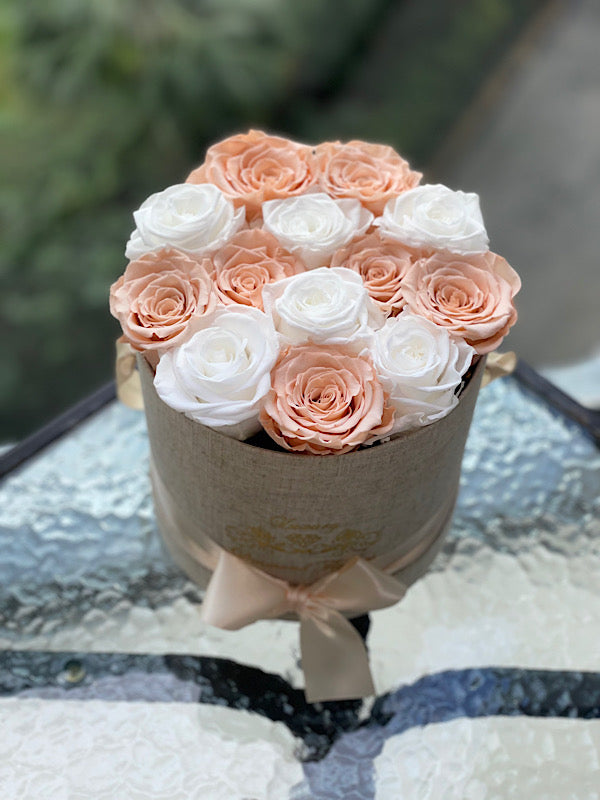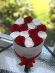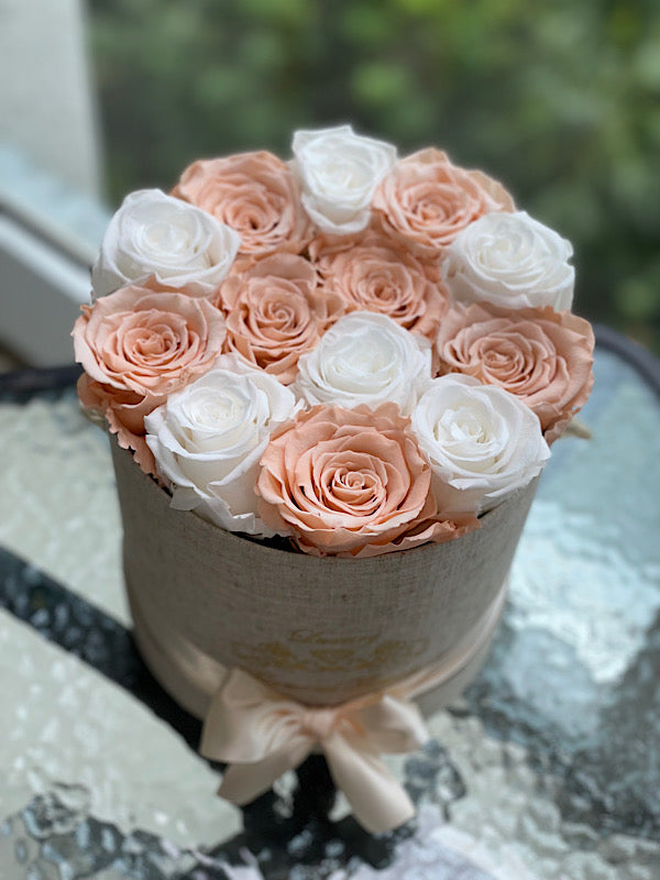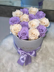 12-14 eternal mix roses of 2 color in round box will last years. You can choose any rose color