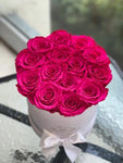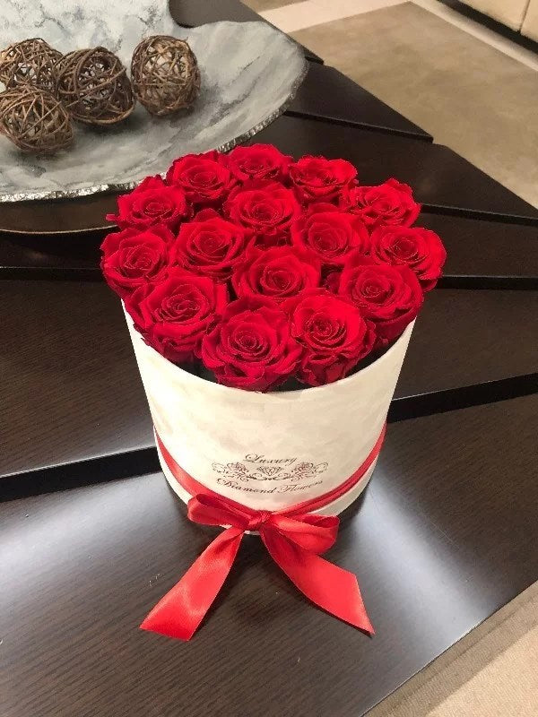Up to 14 eternal red roses in round velvet box will last years.