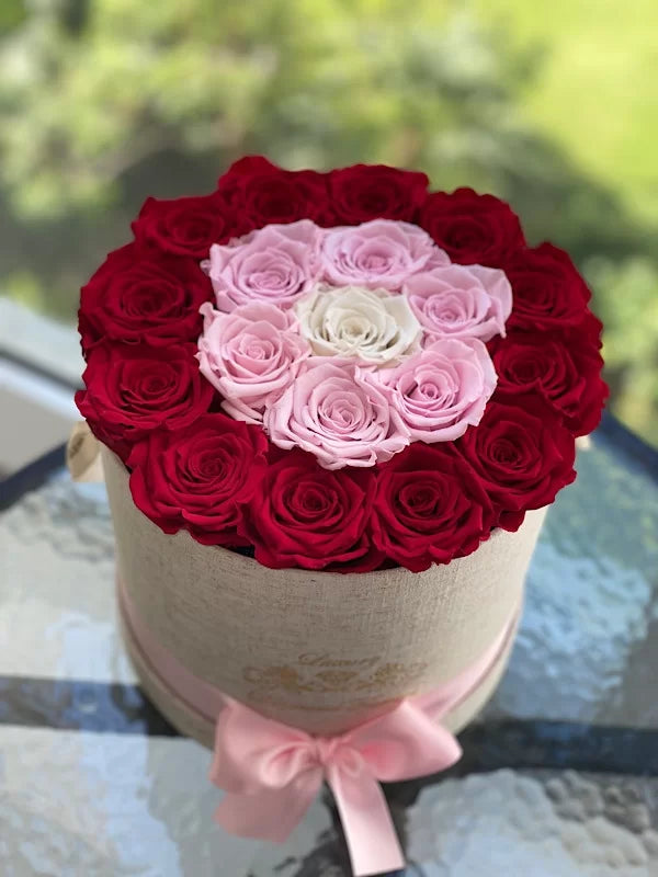 Up to 19 preserved roses New York floral arrangement Ombré last a year in round box. Mix of Red roses, pink roses and one white rose in the middle.