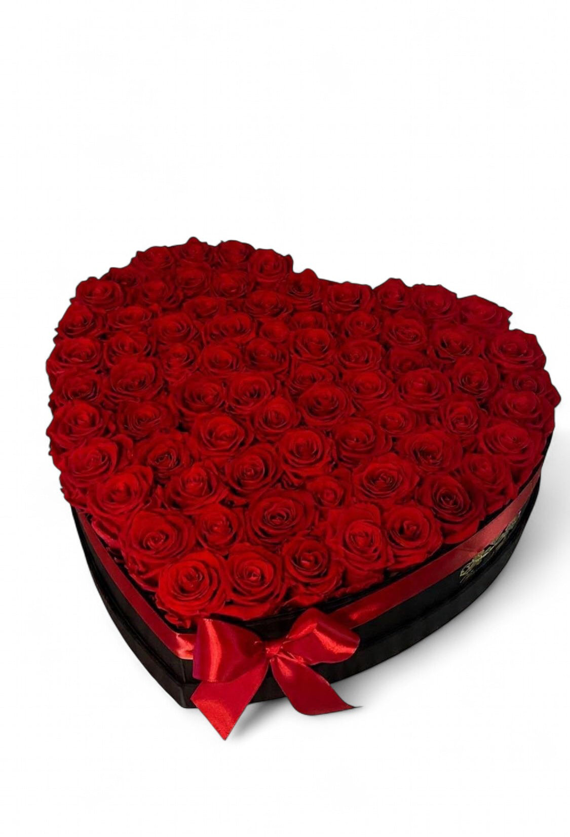Valentine roses is 45 red roses in heart shape box will last years. Flower delivery same day in Miami.