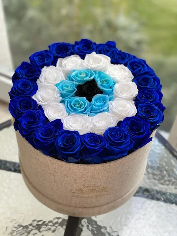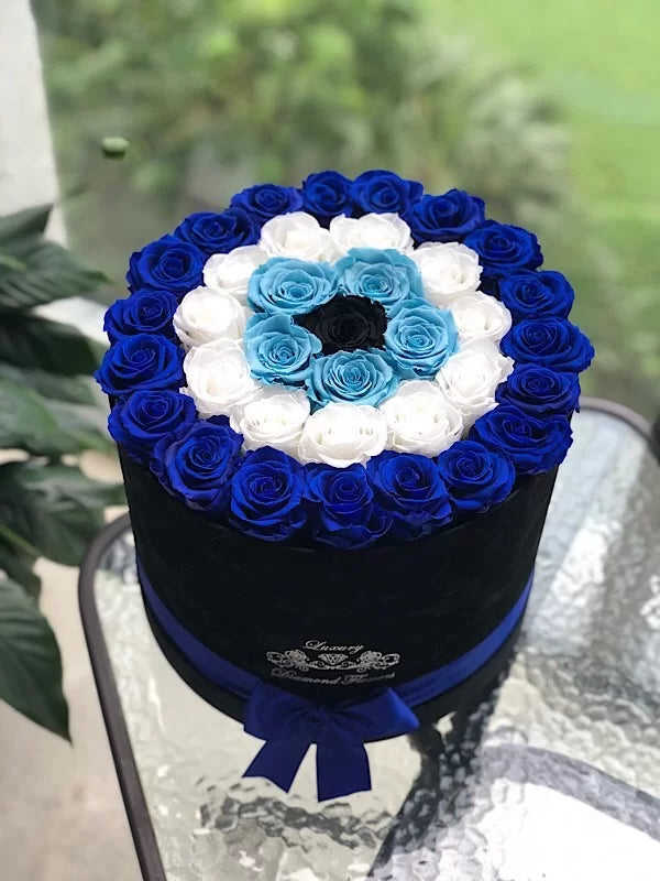 Evil eye flower arrangement of 40 preserved Ecuadorian roses last years, royal blue roses, baby blue roses, white roses and black roses in the middle flower arrangement.