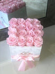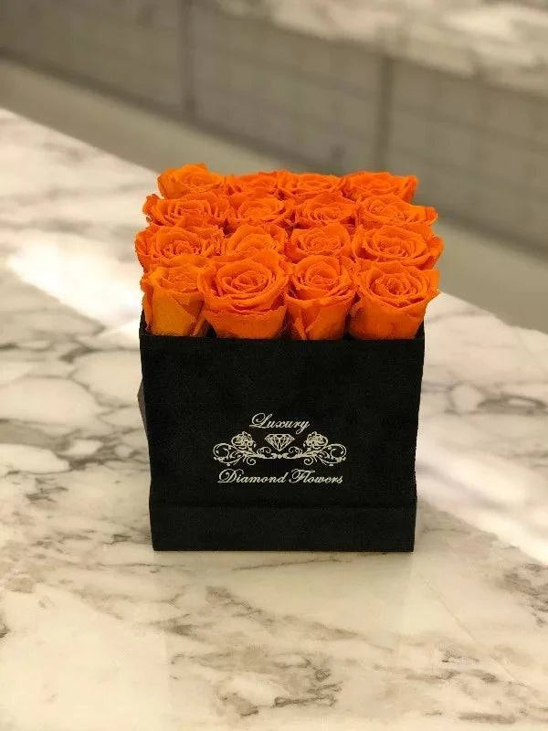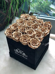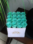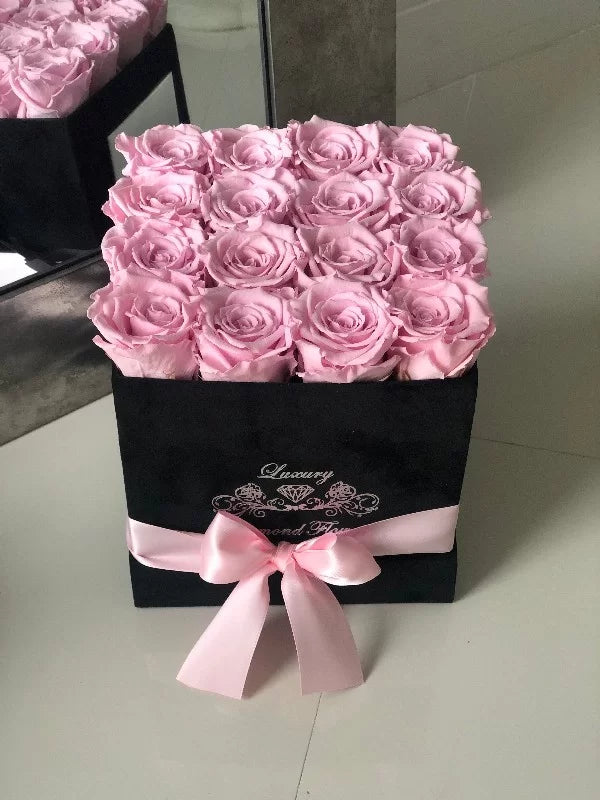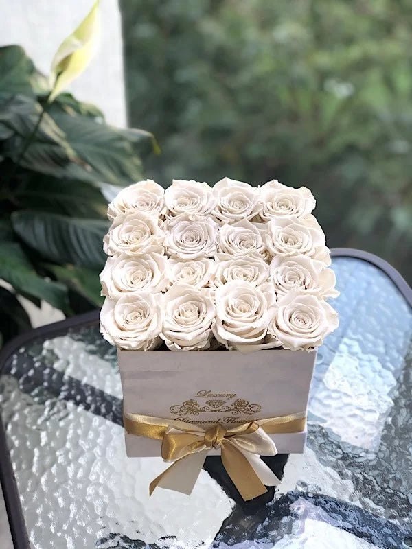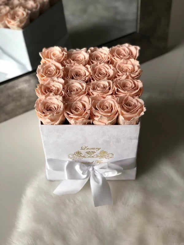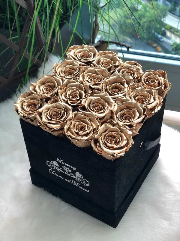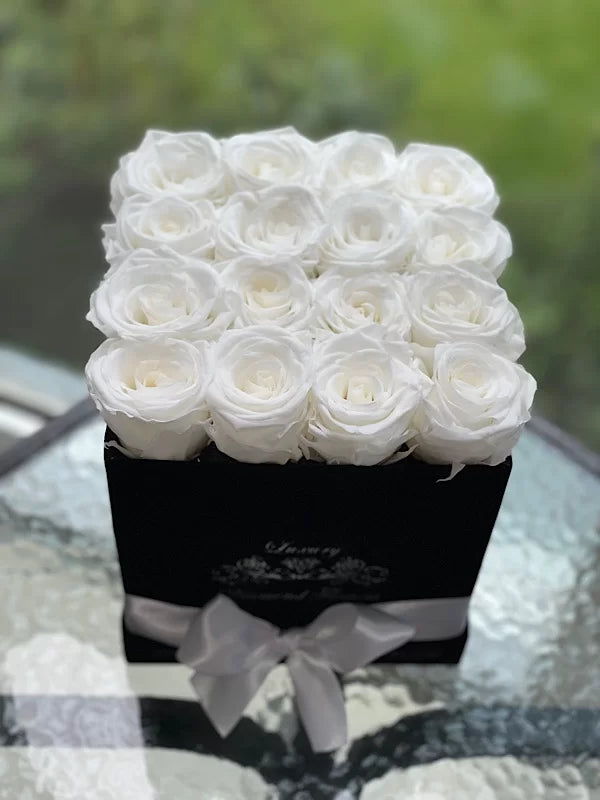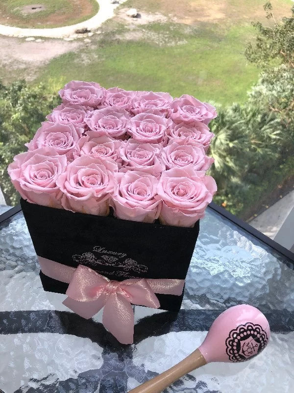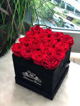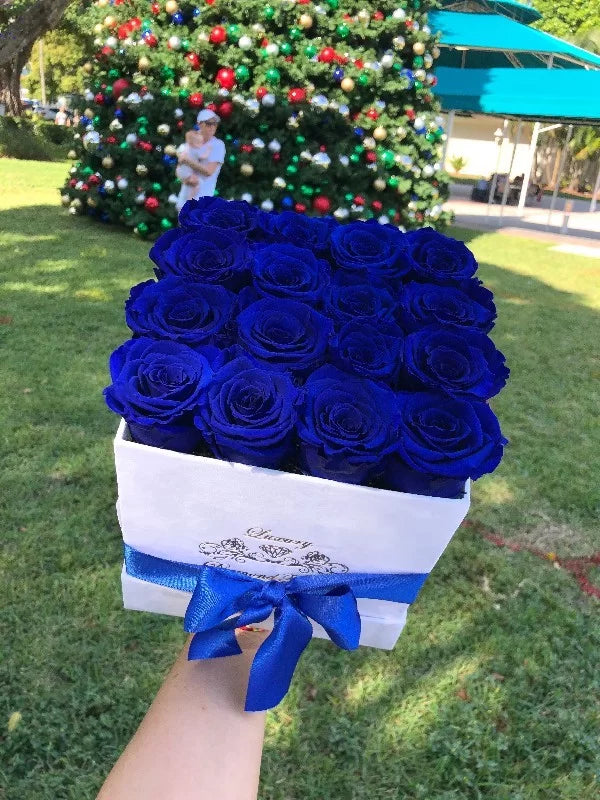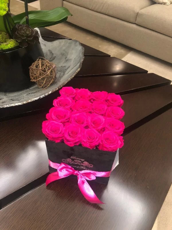 Palm Beach roses is 16 real Ecuadorian roses in square velvet box will last years without any maintenance.